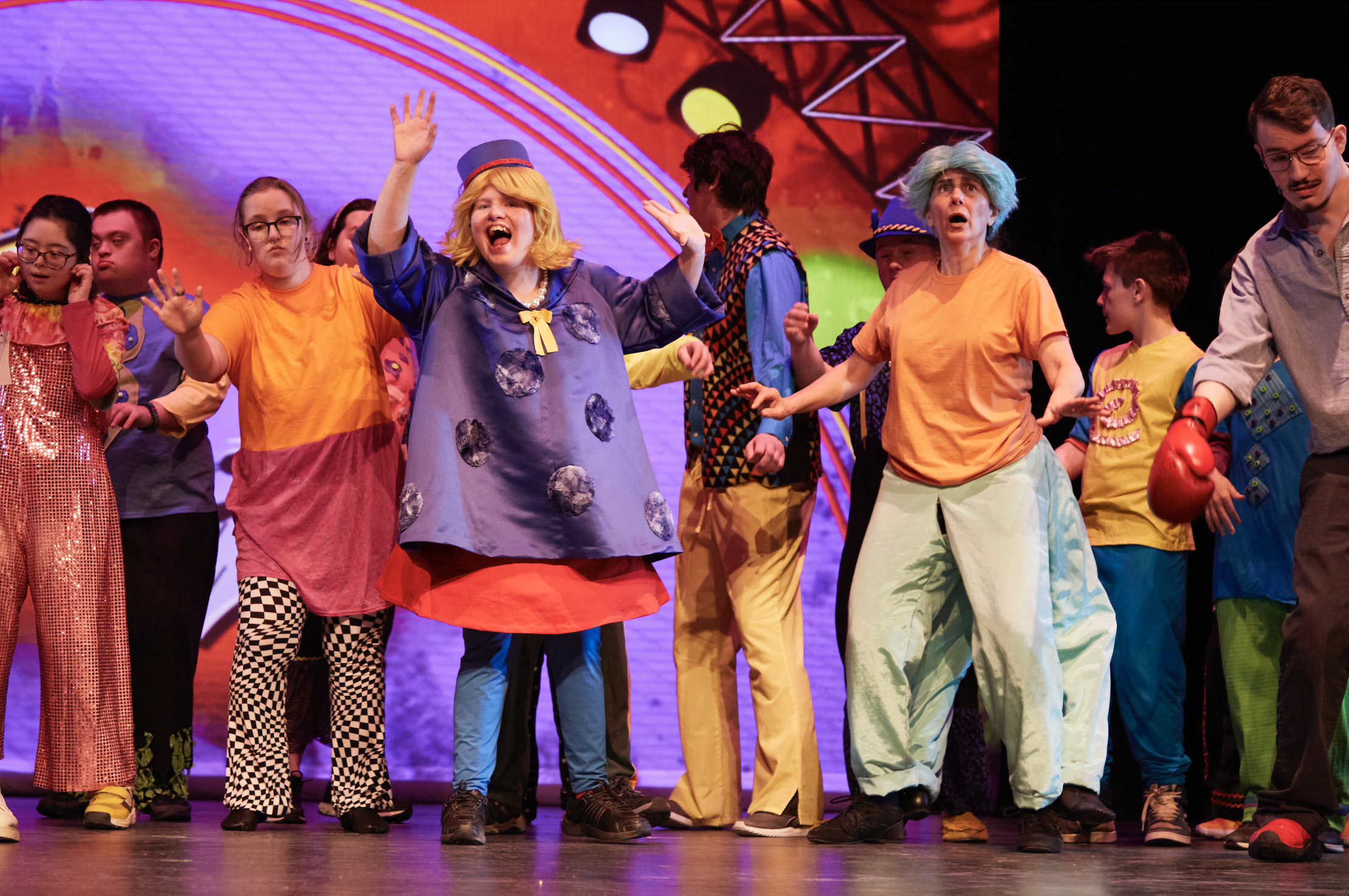 Flamboyantly, colorful cast of Seussical 2018 in front of the Whoville backdrop, singing the last notes of the finale with arms raised in triumph.